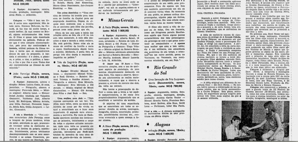 Argumento e roteiro: Fernando Antônio de Andrade, Júlio Alberto Simon e Teógnis Mota Nunes; Fotografia: Teógnis Mota Nunes; Montagem: Fernando Antônio de Andrade Araújo e Teógnis Mota Nunes; Elenco: Ana Lúcia Mischyle Costa e Silva, Bráulio Leite Neto