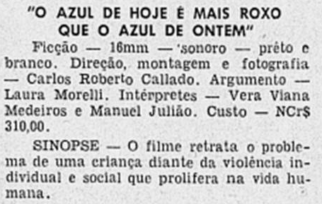 O AZUL DE HOJE É MAIS ROXO É O AZUL DE ONTEM Home Festival de Cinema Amador do Jornal do Brasil O AZUL DE HOJE É MAIS ROXO É O AZUL DE ONTEM Captura de tela 2026-02-10 175214 Baixar Metadados TítuloO AZUL DE HOJE É MAIS ROXO É O AZUL DE ONTEMAno1969GêneroFicçãoEstadoRio de Janeiro – RJCromiaPBSomSonoroEdição do festivalV Festival de Cinema AmadorDireçãoCarlos Roberto CalladoFicha técnicaMontagem e fotografia: Carlos Roberto Callado Argumento: Laura Morelli Intérpretes: Vera Viana Medeiros e Manuel JuliãoSinopseO filme retrata o problema de uma criança diante da violência individual e social que prolifera na vida humana Item anteriorO TÚNEL Próximo itemMAQUIMUT