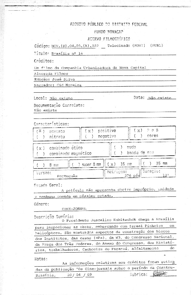 Orquestra no Teatro Nacional; Teatro Nacional à noite, platéia, foyer do teatro; obras no Teatro Nacional; instalação do carpete em uma das salas; público aplaude um quarteto de cordas, coral cantando; homens verificam as plantas arquitetônicas do Teatro Nacional; vista do Teatro Nacional para o Conjunto Nacional; apresentação de balé; homens andam pela estrutura externa do Teatro Nacional; pessoas caminham na frente do Eixo Monumental; Palácio do Planalto; Congresso Nacional; Palácio da Justiça; Universidade de Brasília - Instituto Central de Ciências; crianças em balanço no parquinho; animais no Zoológico; corrida no autódromo; jovens jogando vôlei; quadra de esportes; jogadores de tênis e golf; veleiros no lago Paranoá; trânsito de carros, quadra comercial; placa em supermecado "SAB-SUPERMECADO 3"; superquadra residencial; Congresso Nacional.